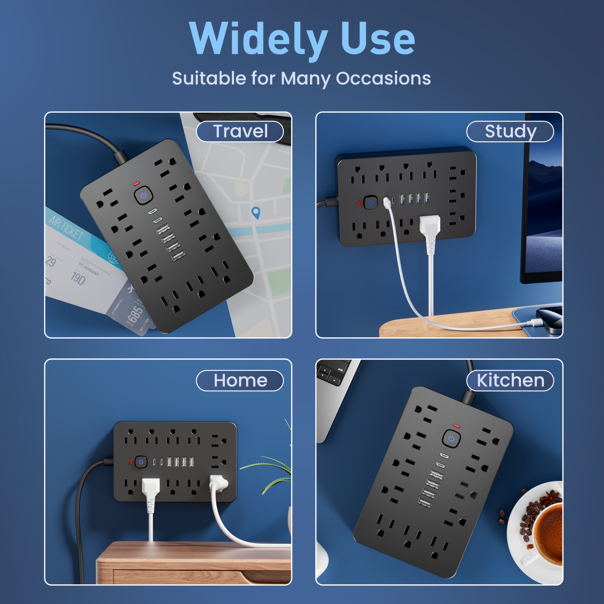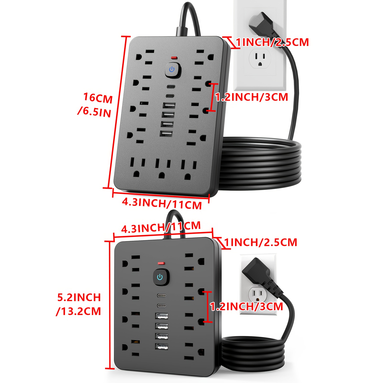 17-in-1/14-in-1 Power Outlet, 152.4cm Cord, 11/8 Sockets, 4 USB + 2 USB-C Ports, Flat Plug, Wall Mountable, Overload Protection, Essential for Home Office